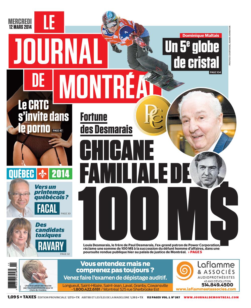 *CP is 1/3-owned by Square Victoria Communications Group, which publishes La Presse and is a subsidiary of Power Corp., which was featured on the cover of Wednesday’s Quebecor-owned Journal de MontréalLa Presse put Péladeau on its cover.